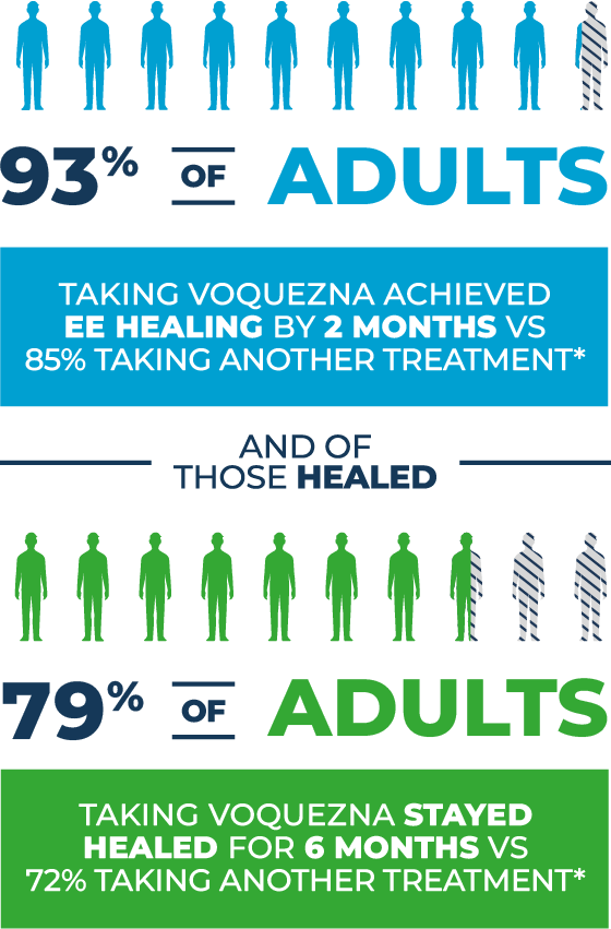 VOQUEZNA was evaluated in a clinical trial of adults with endoscopically confirmed EE. One group took VOQUEZNA 20 mg once daily for 2 to 8 weeks during the healing phase. 93% of adults taking VOQUEZNA for EE experienced healing by 2 months (compared to 85% taking another treatment*).